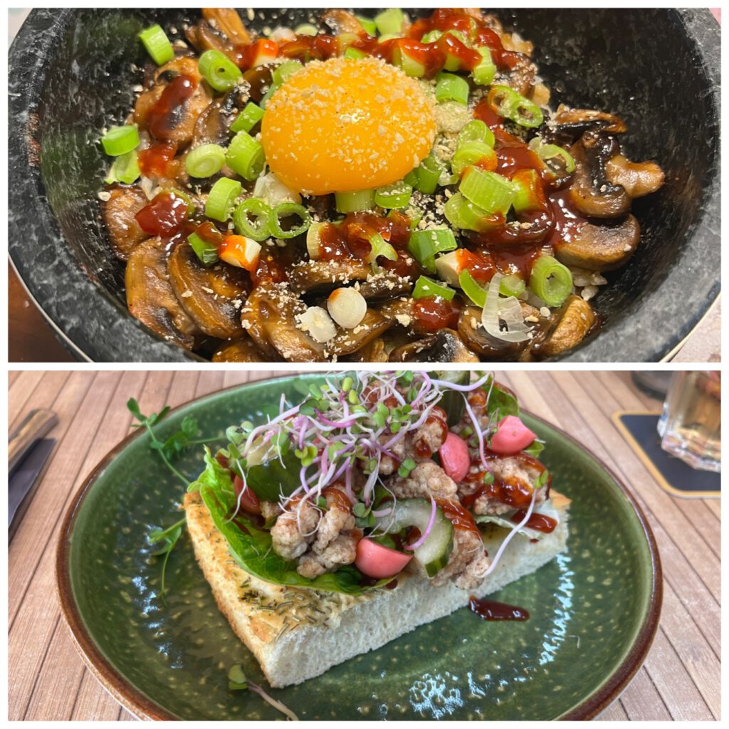 At home: Bibimbap with only miso mushroom topping | Out: KFC on Foccacia