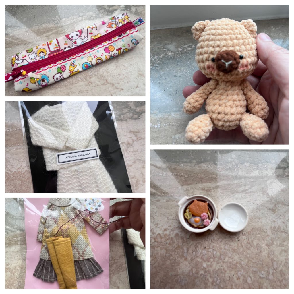 This weeks Minne arrival, facilitated by Doorzo, had a mix of things. Two outfits, a crocheted bear, a pencil case and a miniature food prop.